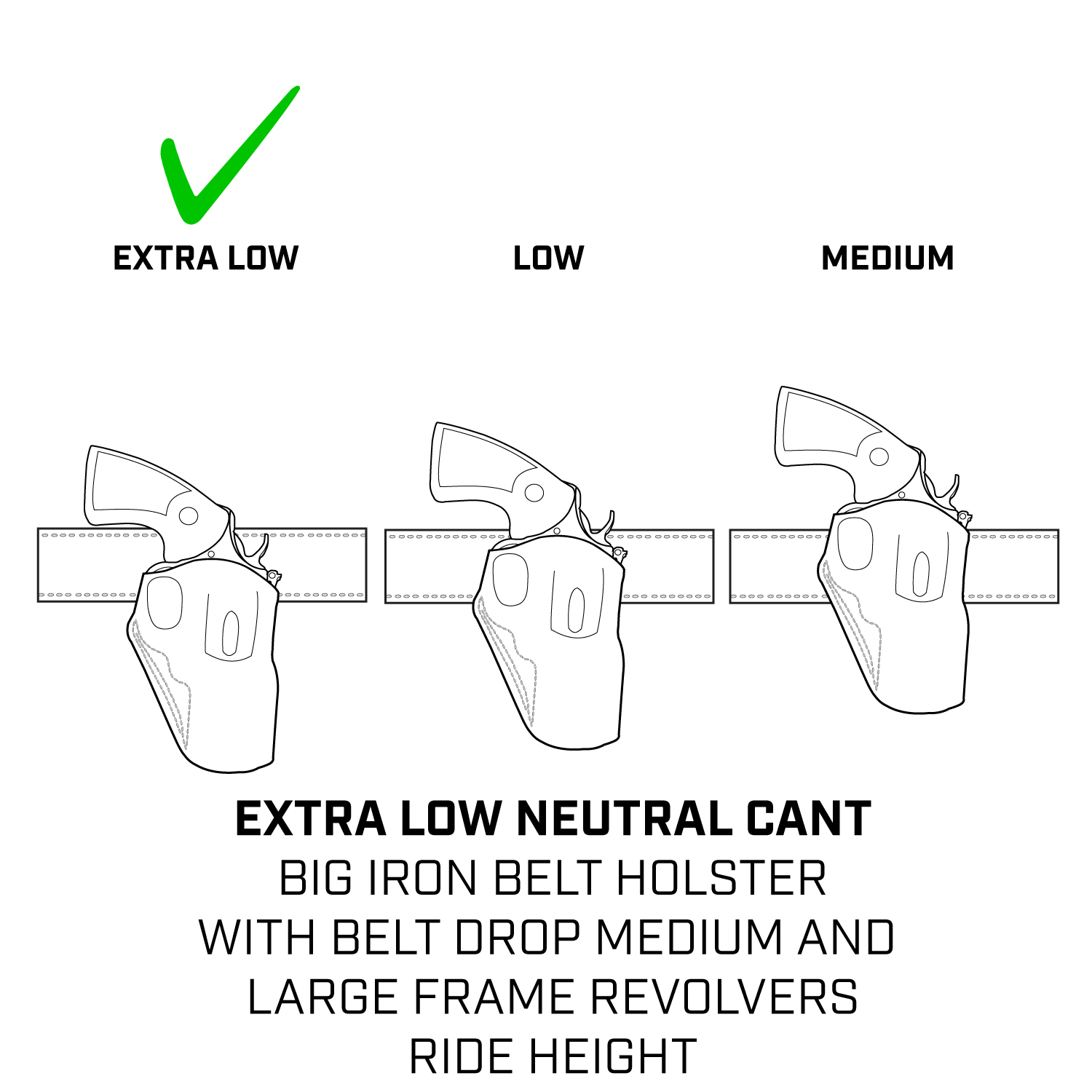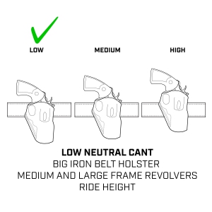 Packaged with a polymer belt slot that’s adjustable for belt width, a Belt Drop is also available as an option. It can increase the speed of the draw, sit clear of equipment ranging from rain gear to body armor, ride below a backpack’s waist straps, and make the draw easier for short-waisted and/or female shooters. The Big Iron's leg thong is particularly useful when used in combination with the Belt Drop.