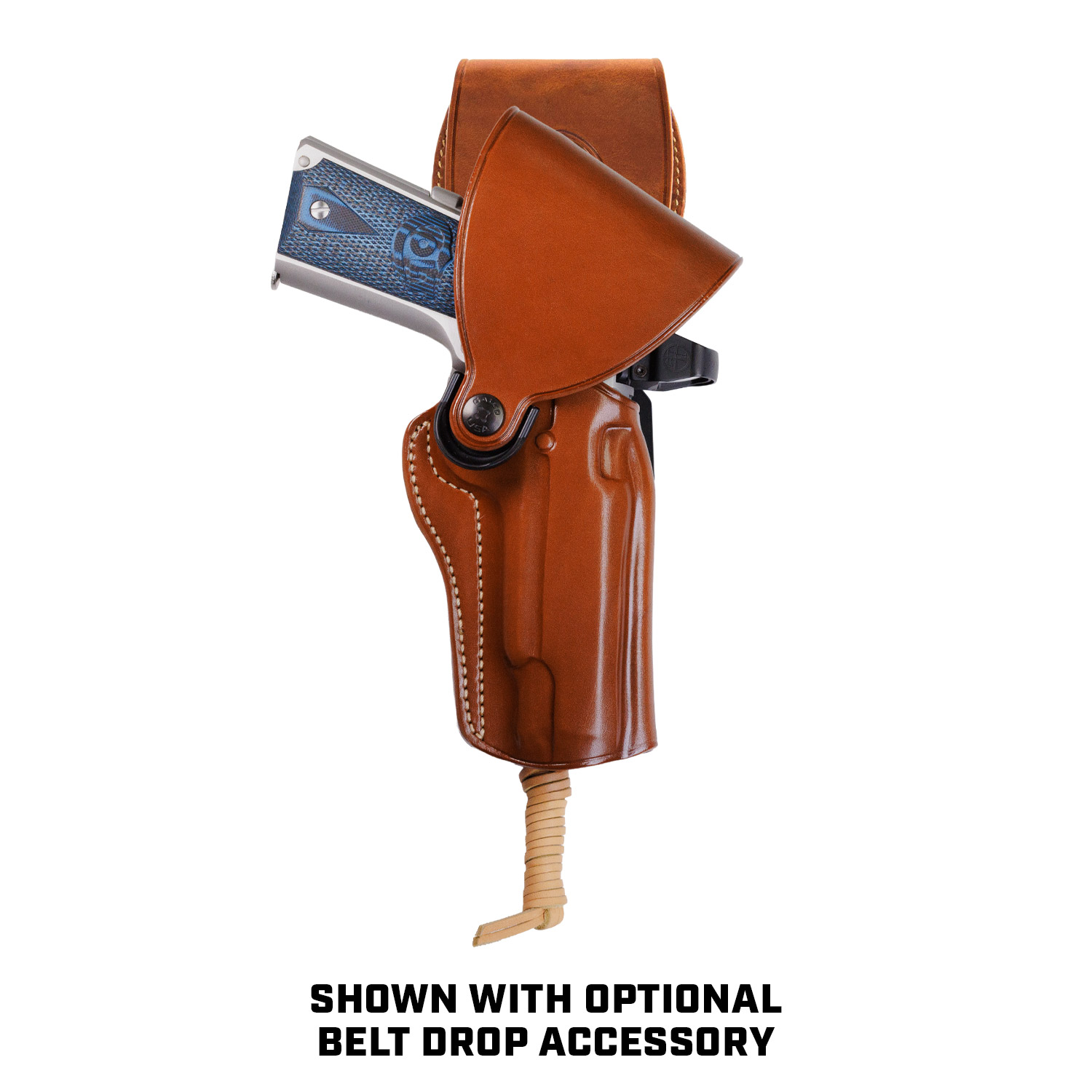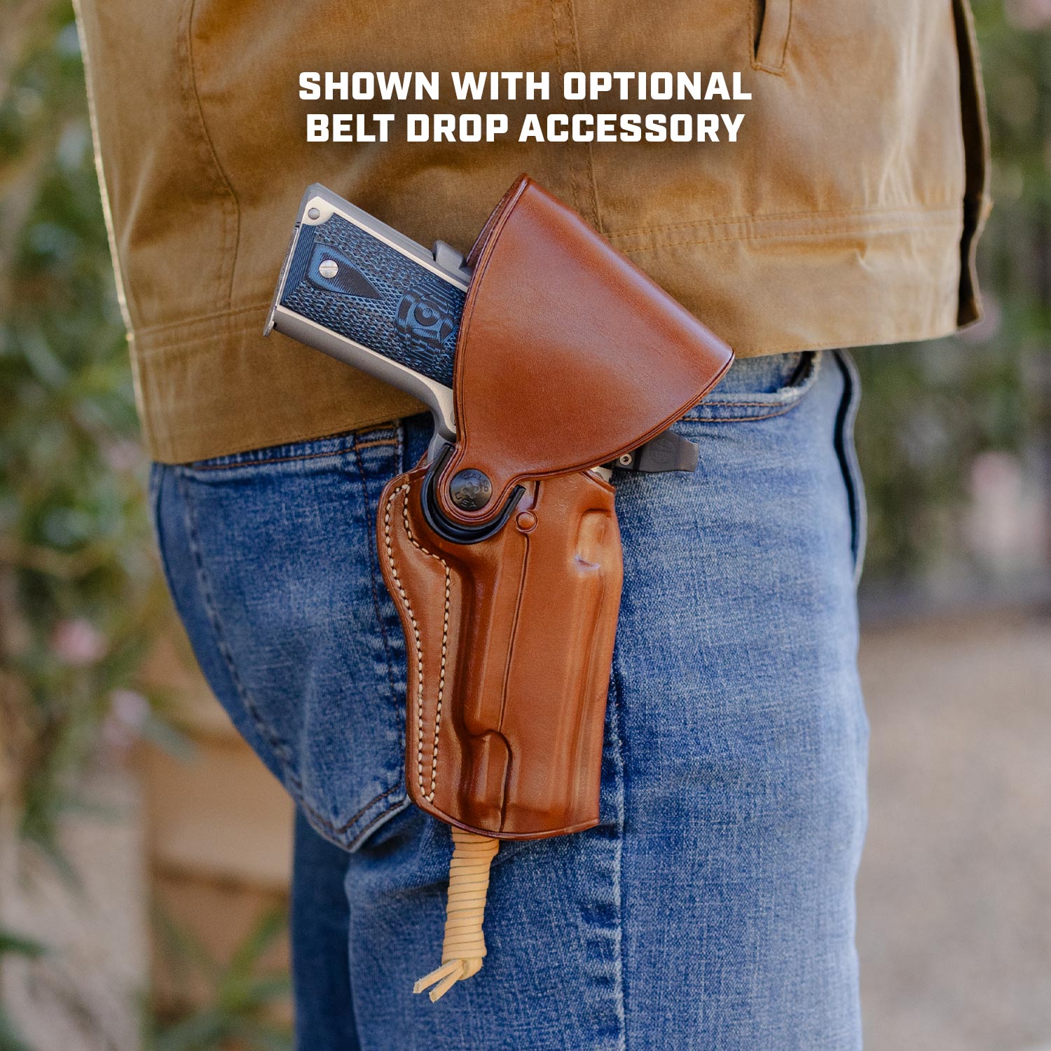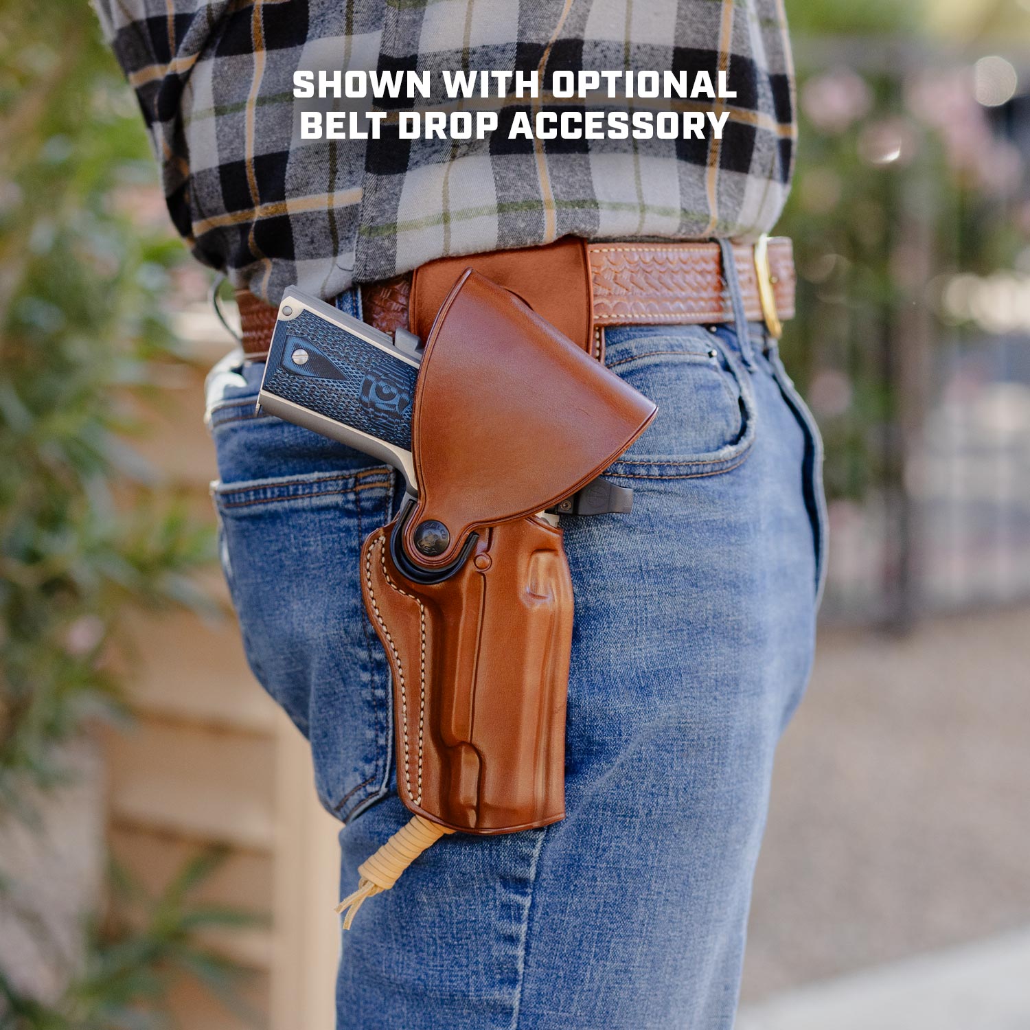 Packaged with a polymer belt slot that’s adjustable for belt width, an optional Belt Drop is also available. It can increase the speed of the draw, clear equipment ranging from rain gear to body armor, ride below a backpack’s waist straps, and make the draw easier for short-waisted and/or female shooters. The Brush Hog's leg thong is particularly useful when used in combination with the optional Belt Drop.