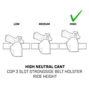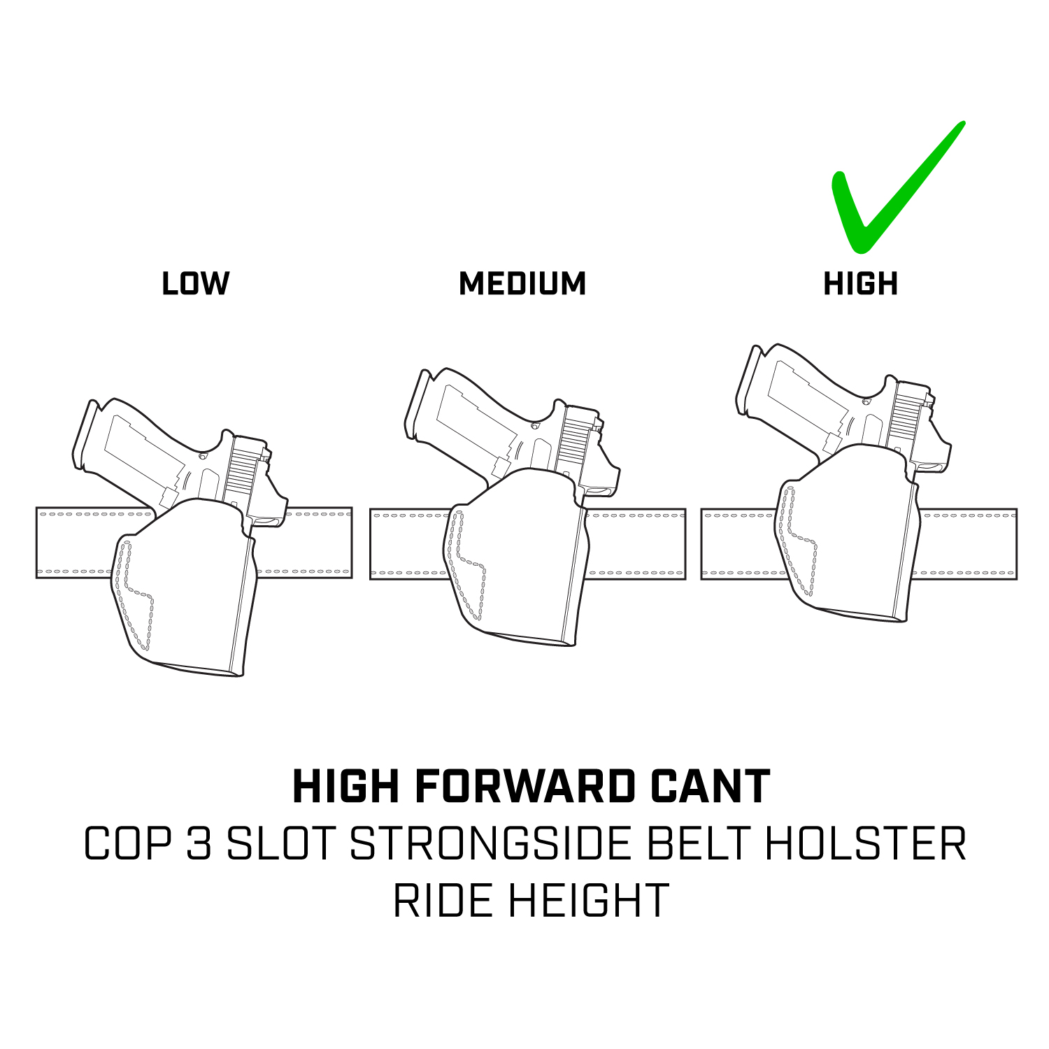 Galco’s Cop 3 Slot ™ holster is precision-molded and allows comfortable carry in both forward and near-neutral cant positions, by using one of two forward belt slots. A tension screw adjustment near the trigger guard facilitates maximum firearm retention, while the rear sight is protected by a wide safety strap and reinforced thumb break. The low-cut design allows for easier, faster clearance of the firearm from the leather.