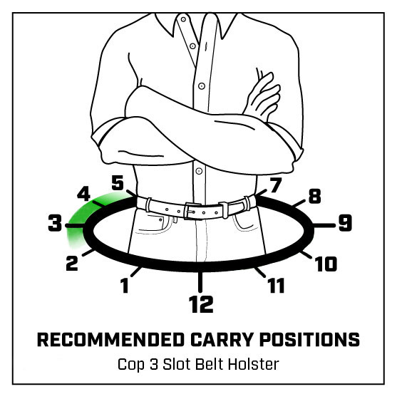 Galco’s Cop 3 Slot ™ holster is precision-molded and allows comfortable carry in both forward and near-neutral cant positions, by using one of two forward belt slots. A tension screw adjustment near the trigger guard facilitates maximum firearm retention, while the rear sight is protected by a wide safety strap and reinforced thumb break. The low-cut design allows for easier, faster clearance of the firearm from the leather.