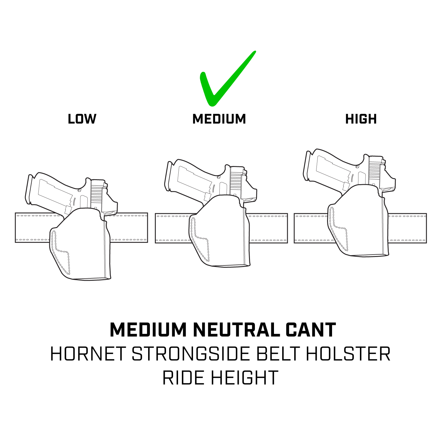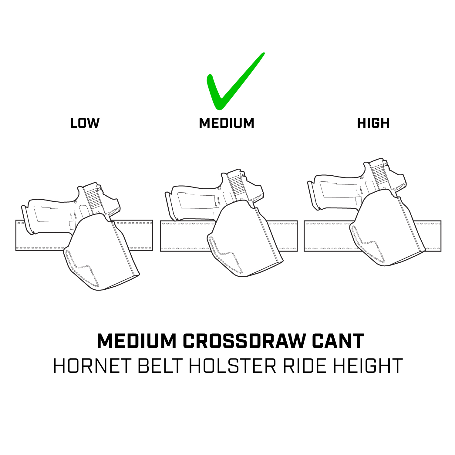 Constructed of premium steerhide, the Hornet uses a tunnel-style belt loop mated with a belt slot, resulting in excellent stability on the belt. A slight butt-rear cant facilitates an easy draw from either the crossdraw or appendix position, while the open top makes the draw fast and simple.