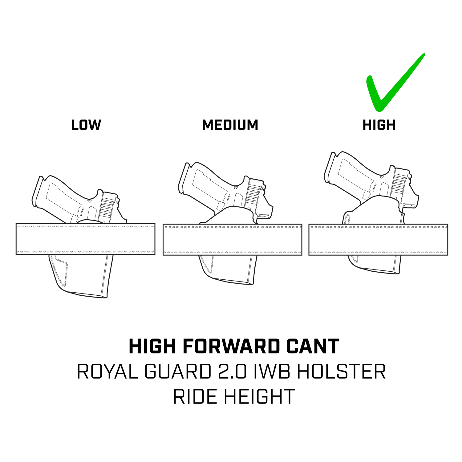 Constructed of premium horsehide, the Royal Guard™ 2.0 has the rough side of the leather out for greater stability in the pants, while the smooth side of the leather lies against the handgun for a slicker draw feel. The butt-forward cant increases concealability when worn behind the strong hip, while the addition of a raised sweat guard protects both the handgun and the gun carrier.